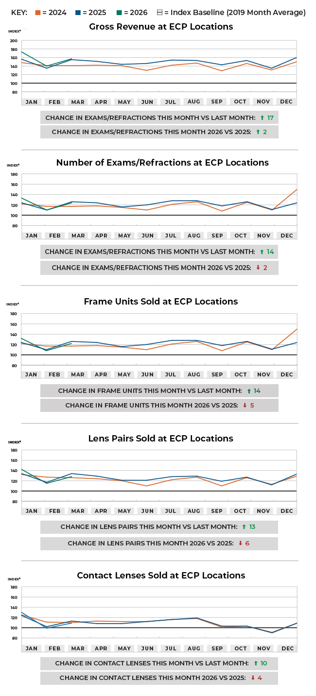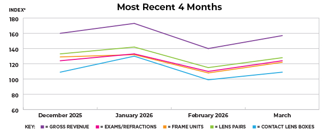 Following the increase in gross revenue, all other optical sales categories also increased last month when compared with the previous month, at rates of 14 index points (exams/refractions), 14 index points (frame units), 13 index points (lens pairs), and 10 index points (contact lenses). When comparing last month’s optical sales with the same period last year, all of the other categories decreased at rates of -2 index points (exams/refractions), -5 index points (frame units), -6 index points (lens pairs), and -4 index points (contact lenses).
