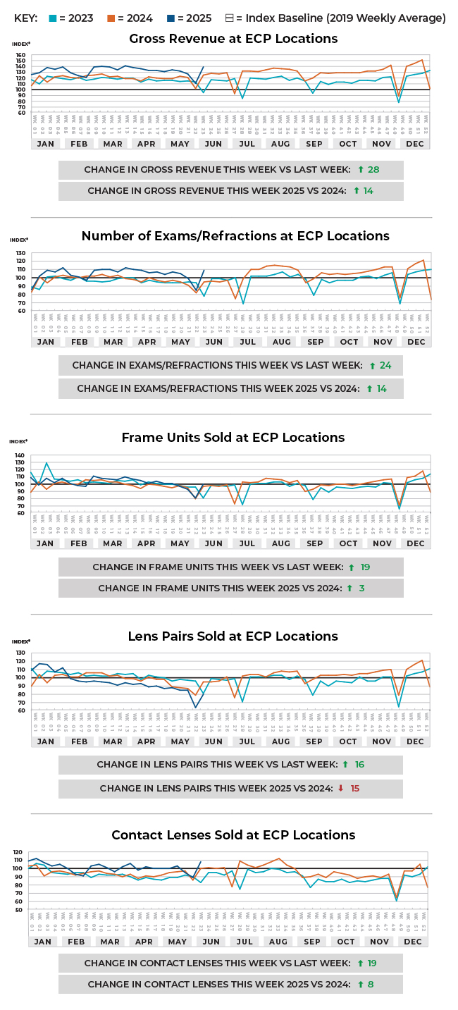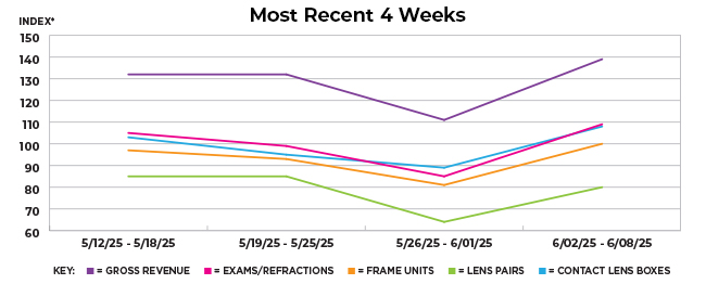 All optical sales categories increased last week when compared with the previous week, at rates of 28 index points (gross revenue), 24 index points (exams/refractions), 19 index points (frame units), 16 index points (lens pairs), and 19 index points (contact lenses). When comparing last week’s optical sales with the same period last year, most of the categories increased at rates of 14 index points (gross revenue), 14 index points (exams/refractions), 3 index points (frame units), -15 index points (lens pairs), and 8 index points (contact lenses).