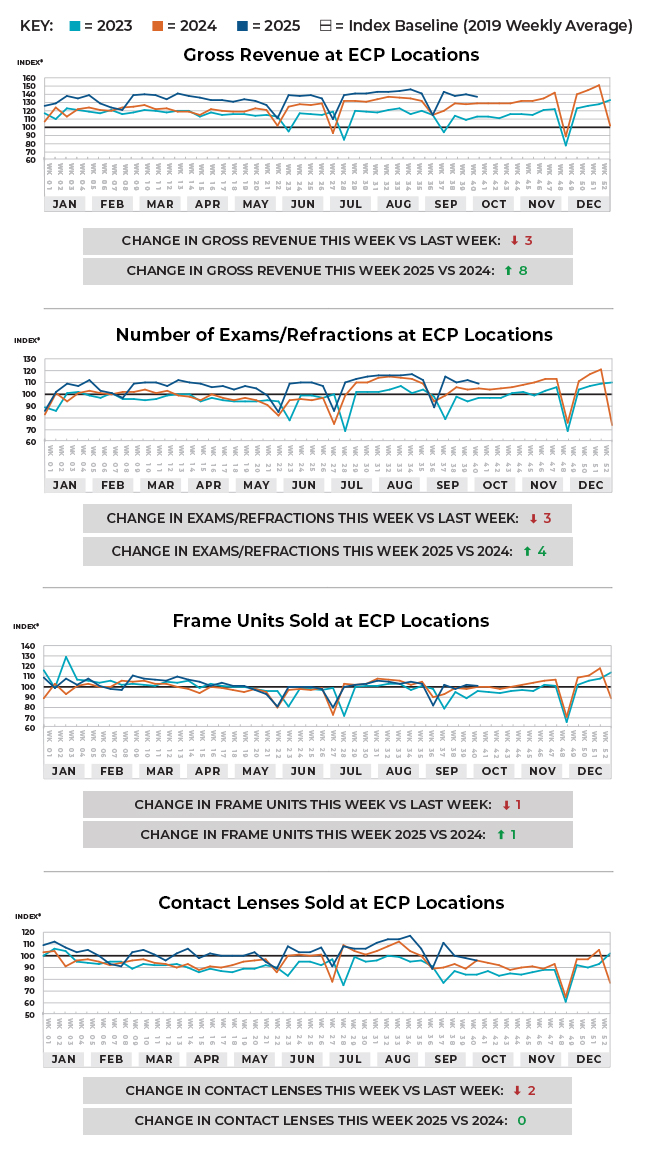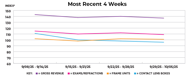 All optical sales categories decreased last week when compared with the previous week, at rates of -3 index points (gross revenue), -3 index points (exams/refractions), -1 index point (frame units), and -2 index points (contact lenses). When comparing last week’s optical sales with the same period last year, most of the categories increased at rates of 8 index points (gross revenue), 4 index points (exams/refractions), 1 index point (frame units), and 0 index points (contact lenses).