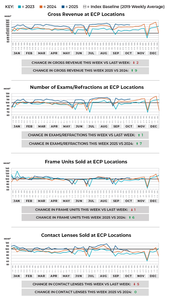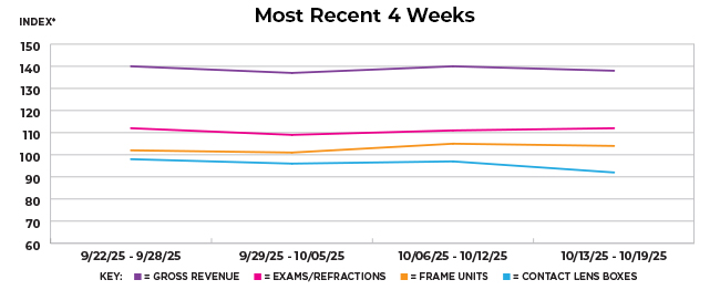 Most optical sales categories decreased last week when compared with the previous week, at rates of -2 index points (gross revenue), 1 index point (exams/refractions), -1 index point (frame units), and -5 index points (contact lenses). When comparing last week’s optical sales with the same period last year, most of the categories increased at rates of 9 index points (gross revenue), 7 index points (exams/refractions), 6 index points (frame units), and 0 index points (contact lenses).