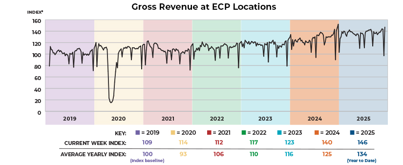 The national average for gross revenue at ECP locations increased last week (December 1st – December 7th) when compared with the previous week at a rate of 50 index points. That places gross revenue at a level 6 index points above where it was at this point in time (Week 49) when compared with last year (2024), 23 points above the same period in 2023, 29 points above 2022, 34 points above 2021, 32 points above 2020, and 37 points above 2019.