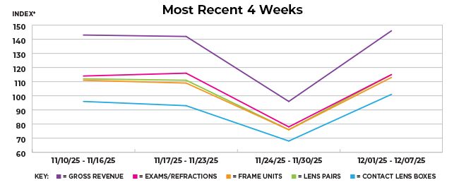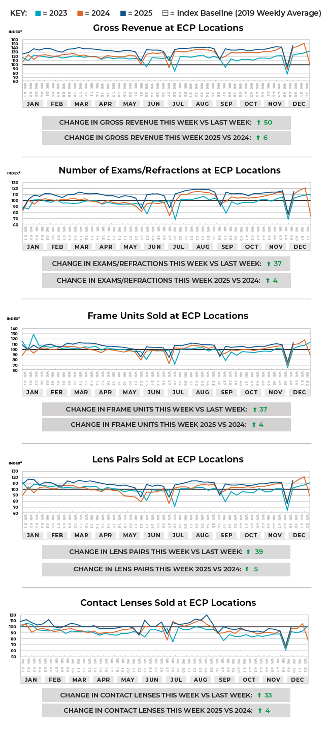 All optical sales categories increased last week when compared with the previous week, at rates of 50 index points (gross revenue), 37 index points (exams/refractions), 37 index points (frame units), 39 index points (lens pairs), and 33 index points (contact lenses). When comparing last week’s optical sales with the same period last year, all the categories increased at rates of 6 index points (gross revenue), 4 index points (exams/refractions), 4 index points (frame units), 5 index points (lens pairs), and 4 index points (contact lenses).